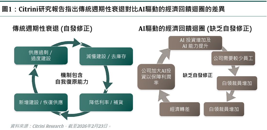這波板塊輪動並非由整體盈利不及預期或鷹派央行政策轉向所觸發,而是源自一篇在X平台爆紅的博文。這篇由獨立研究Citrini發佈的《2028年全球智能危機》,迅速累積數百萬次瀏覽—鑑於其切合時勢的主題,加上行文流暢又引人深思,這並不令人意外。